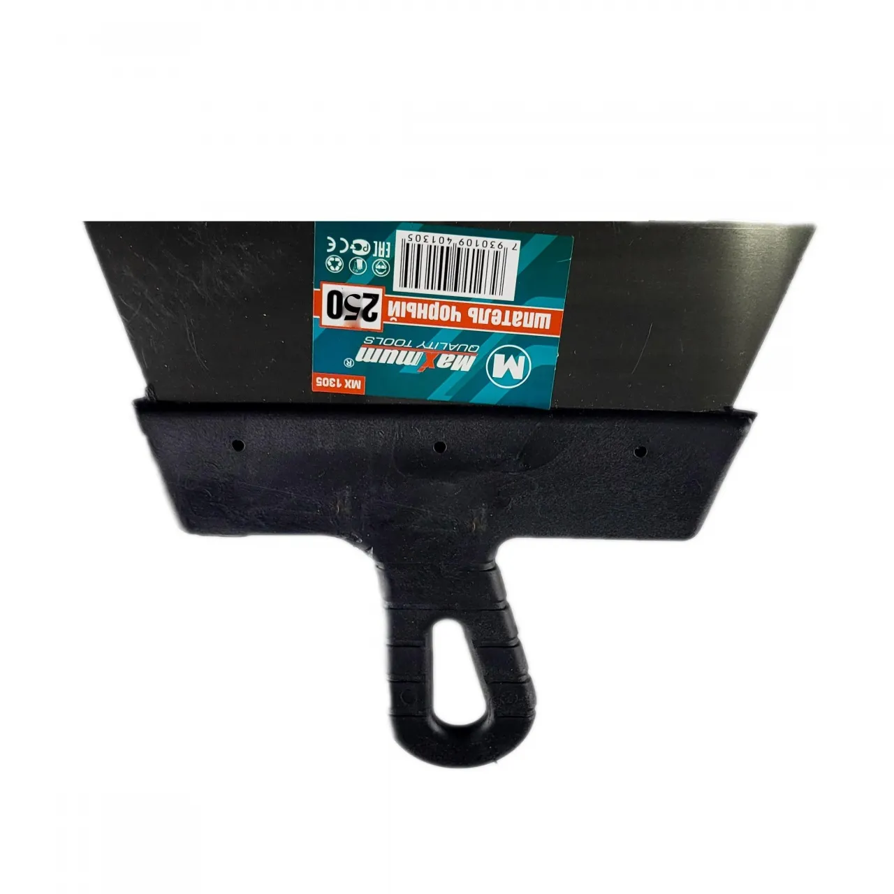 Трапециевидный шпатель 250 мм имеет полотно из нержавеющей стали, устойчивой к коррозии. Ударопрочная облегченная пластиковая ручка с отверстием для подвешивания.